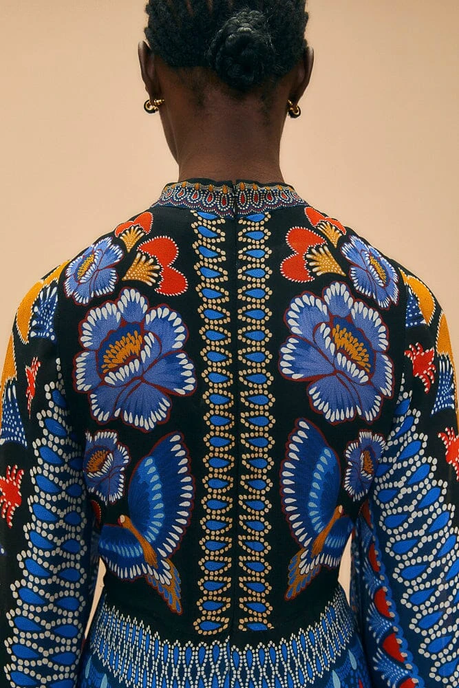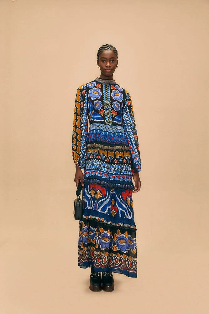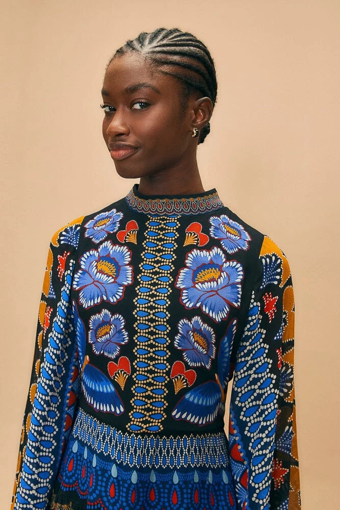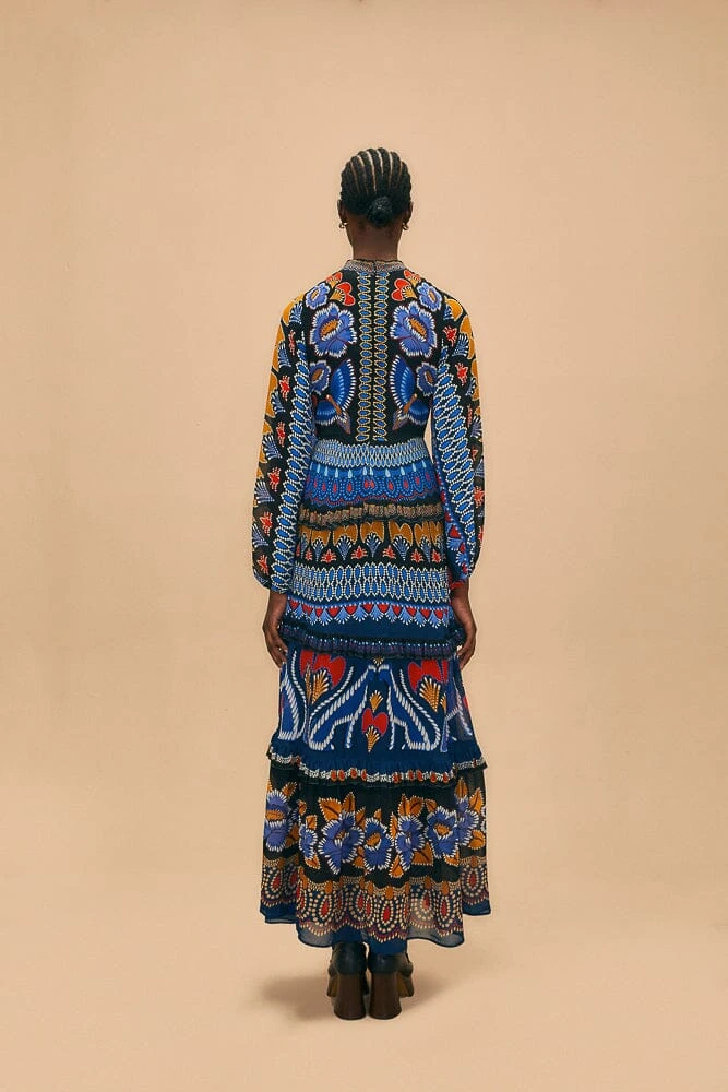 Elegance meets enchantment with the Black Ainika Sparkle Black Long Sleeve Maxi Dress. The high neckline and long sleeves are sophisticated-yet-cozy, while the mesmerizing arabesque print adds a touch of allure. The layered skirt flows gracefully with each step, making it a wardrobe hero to wear on repeat. Make it even more extraordinary by pairing it with FARM Rio Shoes and accessories, and bask in happiness from head to toe.