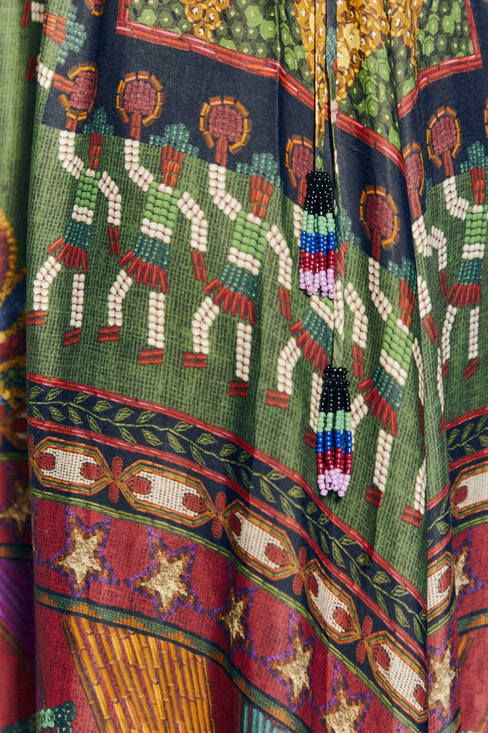 - Adjustable waistline with ties and beaded tassels